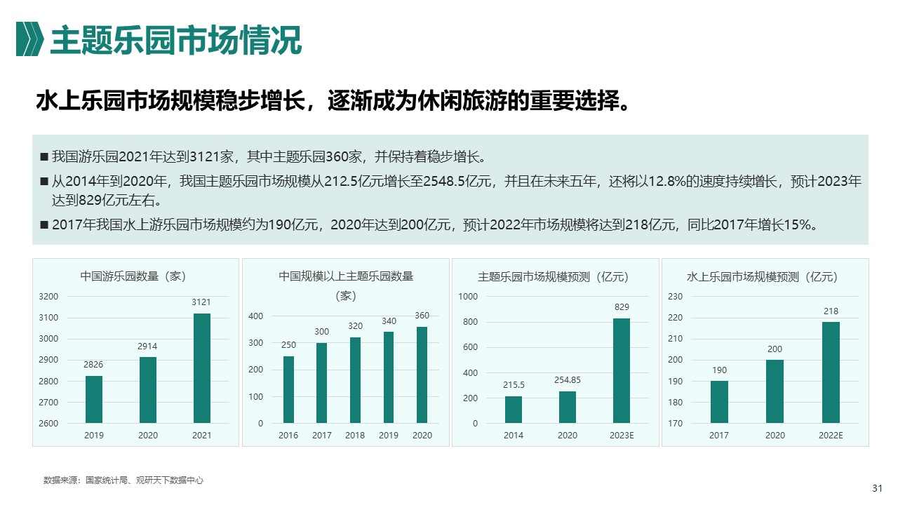 水上乐园市场规模稳步增长,逐渐成为国内休闲旅游的重要选择。我国游乐园2021年达到3121家,其中主题乐园360家,并保持着稳步增长。从2014年到2020年,我国主题乐园市场规模从212.5亿元增长至2548.5亿元,并且预计在未来五年,还将以12.8%的速度持续增长,2023年达到829亿元左右。预计2022年我国水上乐园市场规模将达到218亿元,同比2017年增长15%。