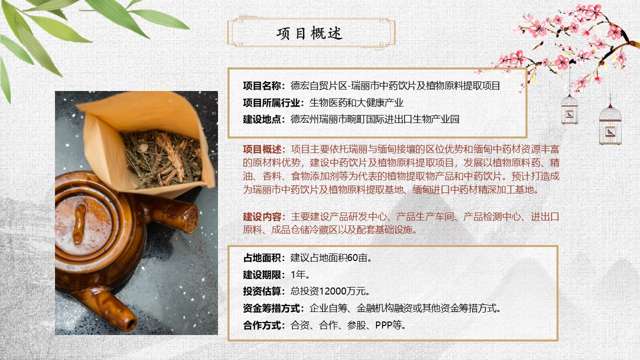 项目主要依托瑞丽与缅甸接壤的区位优势和缅甸中药材资源丰富的原材料优势,在境内靠近口岸的生物产业园区建设对缅甸进口的中药材进行精深加工为中药饮品等多类型产品的加工基地。