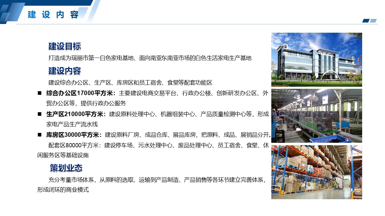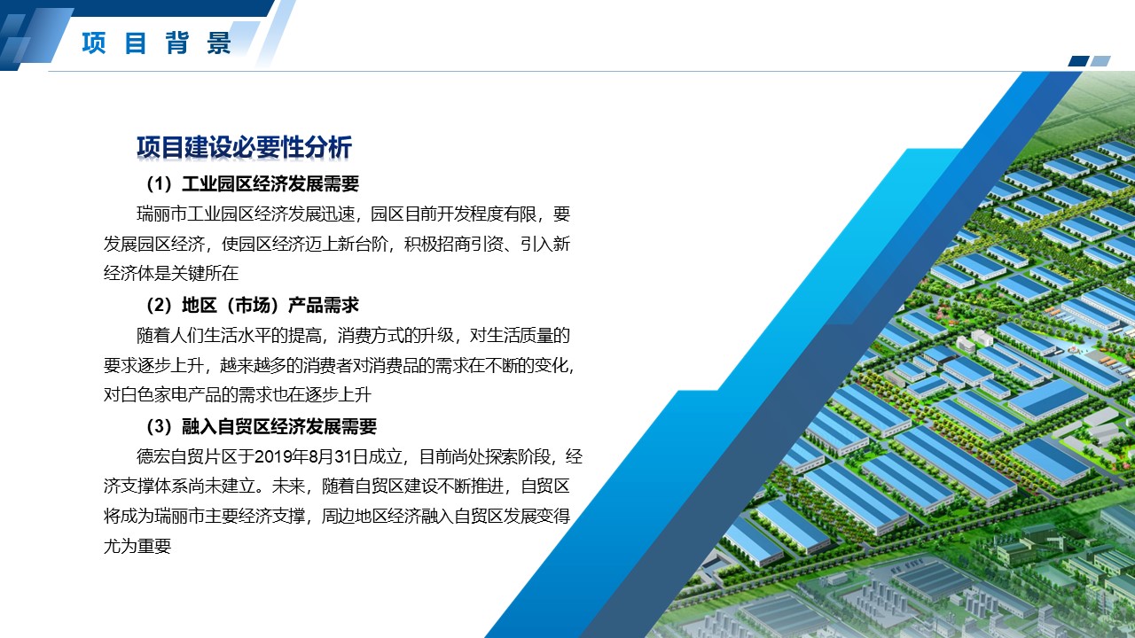项目立足瑞丽工业园区进出口加工制造基地,发挥瑞丽作为我国面向西南开放重要门户位置的地理与交通区位条件,以“一带一路”建设为契机,以南亚东南亚作为市场腹地,利用税收和外汇 管理的优惠政策,将项目打造成为面向南亚东南亚市场的白色生活家电生产基地。