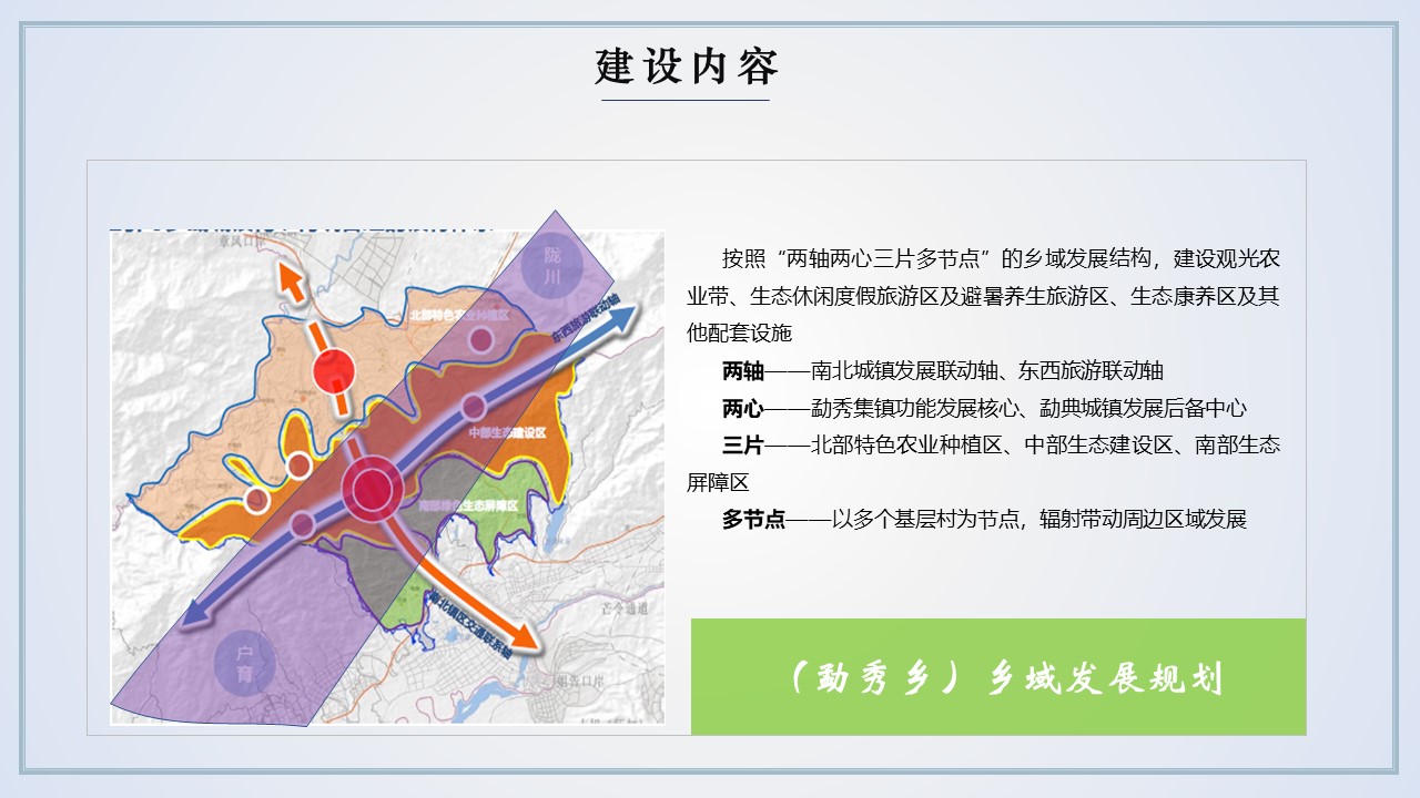 按照“两轴两心三片多节点”的乡域发展结构,建设观光农业带、生态休闲度假旅游区及避暑养生旅游区、生态康养区及其他配套设施