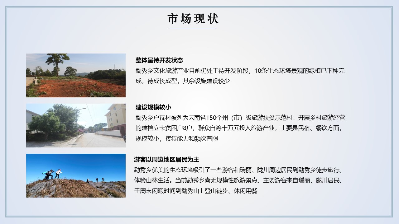 市场定位:核心客源市场—瑞丽市及陇川县;辐射客源市场—德宏州全境、西南地区市场;潜在客源市场—全国及南亚东南亚地区