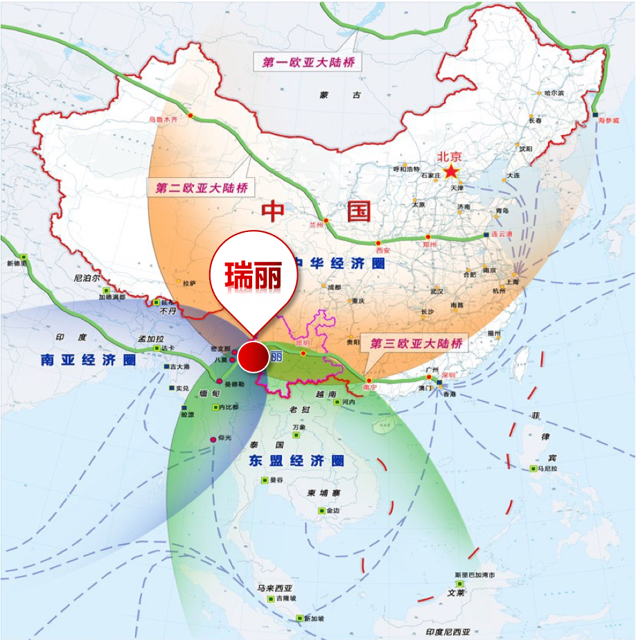 瑞丽毗邻缅甸,处在中华经济圈、南亚经济圈、东盟经济圈的交汇点,是国家实施“一带一路”倡议,推进孟中印缅经济走廊建设和面向南亚、东南亚辐射中心的重要枢纽和节点