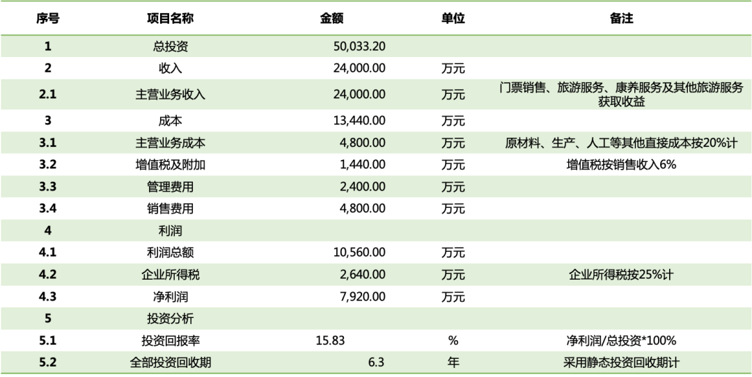 项目建成后,主要以旅游门票销售、农产品、旅游商品销售、康养服务、活动展出以及其他旅游服务获取收益,预计可实现年营业收入24000万元,投资回报率达15.83%,投资回收期约6年