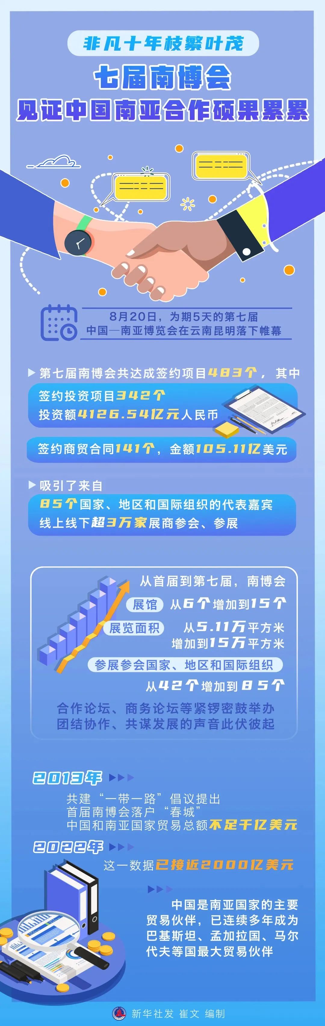 数据显示,第7届南博会共有来自85个国家、地区和国际组织的代表嘉宾,线上线下超3万家展商参会、参展。